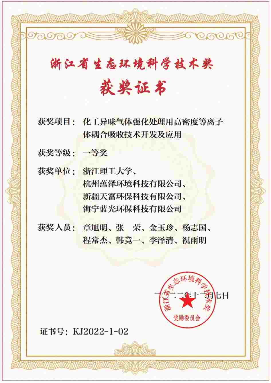 浙江省生態環境科學技術獎是由浙江省生態環境廳的專家組評審,從生態環境治理水平、生態環境高水平保護能力等方面對企業技術進行全面評估。本次獲獎的“化工異味氣體強化處理用高密度等離子體耦合吸收技術”,突破了傳統化工異味氣體治理技術的弊端,創新開發了高密度等離子體耦合吸收技術,充分利用濃度較高的高能活性粒子,深度凈化惡臭異味氣體,實現廢氣高效深度治理。